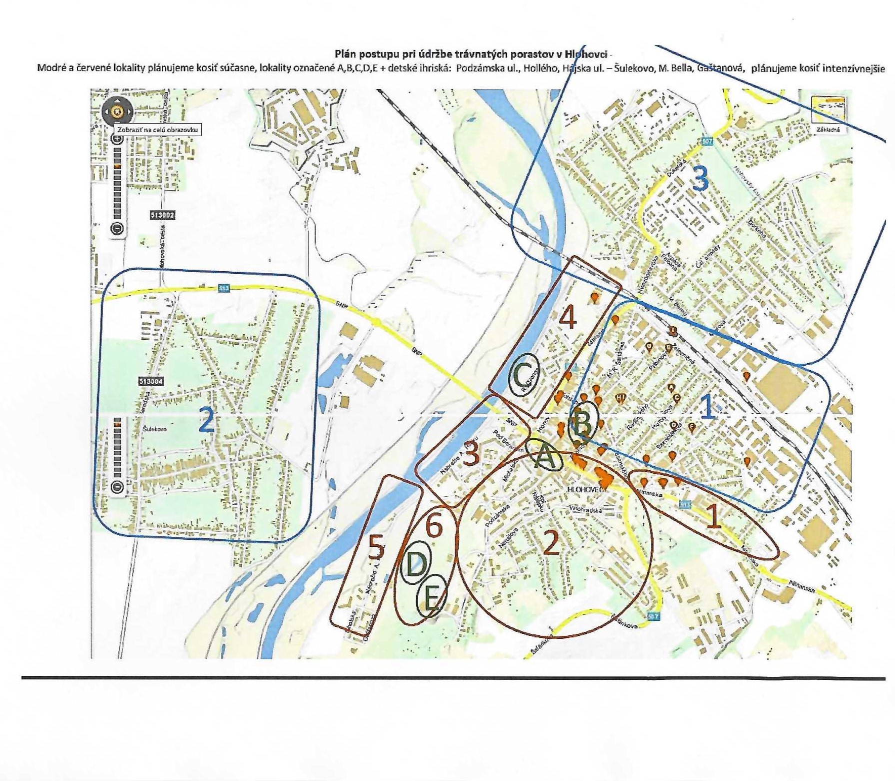 Písmená A až E + vybrané detské ihriská predstavujú plochy vyššej intenzity pri údržbe zelene.