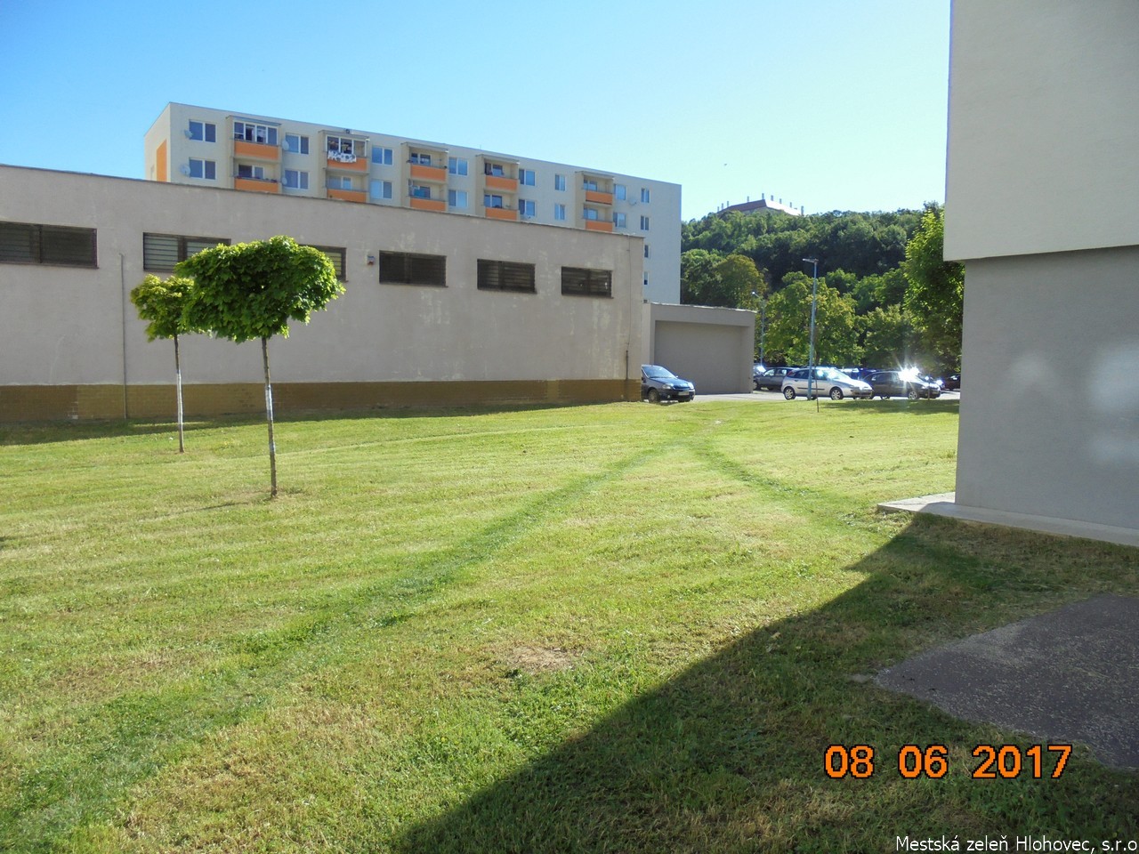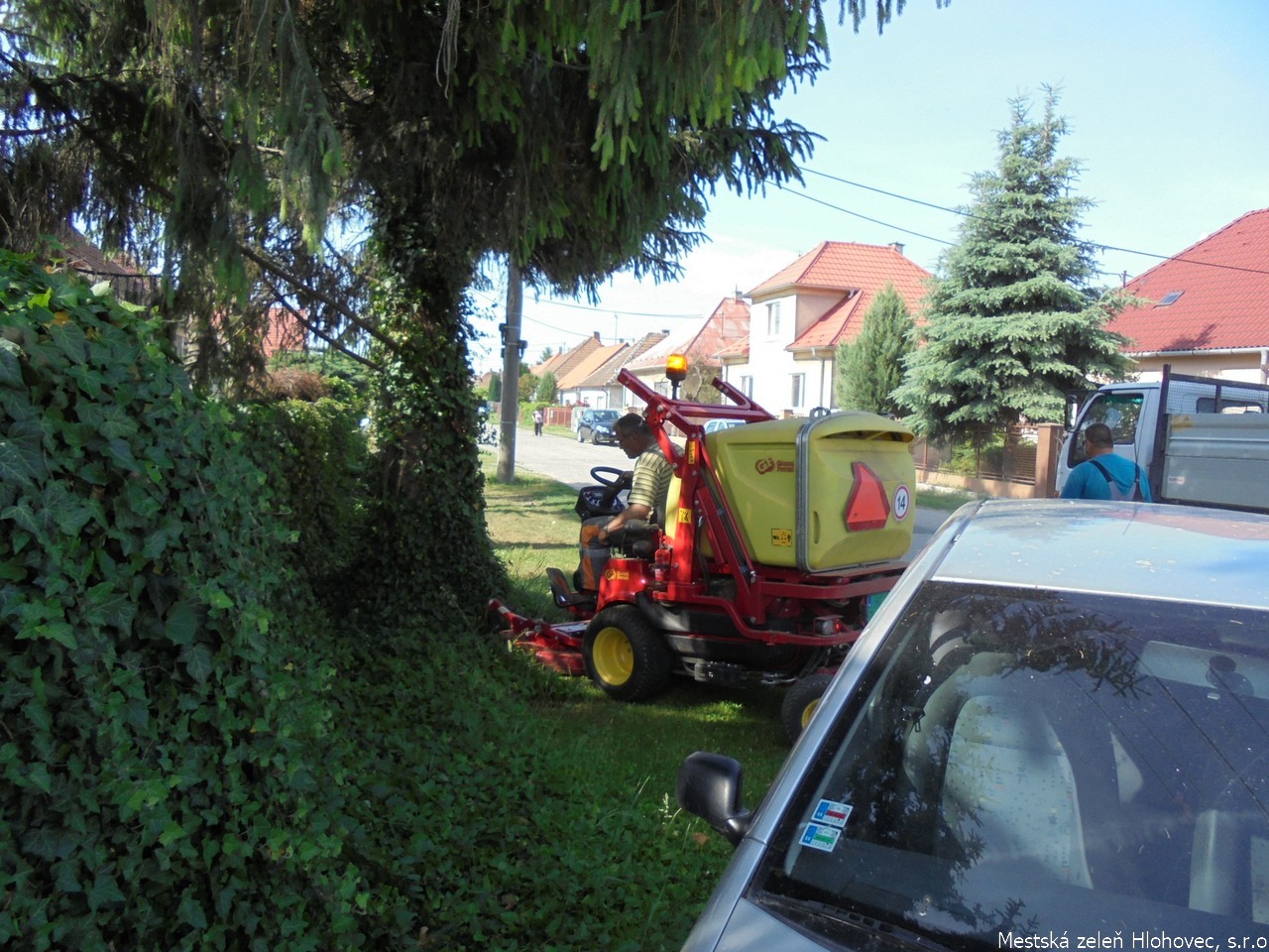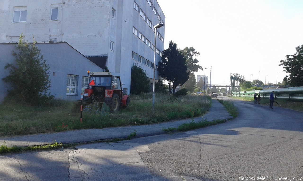 Kosenie trávnatých plôch pri firme Bekaert, vrátane pracovnej soboty, kde boli ťažko dostupné plochy pre koscov kvôli parkujúcim autám.